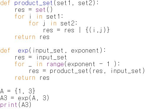 또, 아래에서 정의한 exp() 함수로 set에 대한 거듭제곱을 수행 할 수 있다. 이 때 집합 A의 세제곱은 A A A 이므로 product_set() 함수를 2회 호출하면 된다.