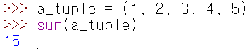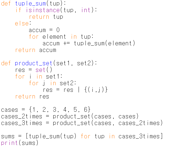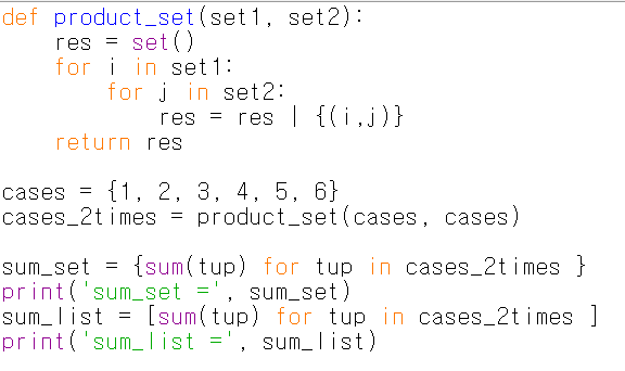 집합과 리스트의 가장 큰 차이는 집합은 중복된 원소가 없다는 것이다. 주사위를 던져서 얻는 경우의 수를 예로 들어보자. 두번 던져서 얻는 모든 경우를 나열하면 각 원소는 주사위 눈을 의미하는 값의 튜플로 나타낼 수 있다. 이 두 눈의 합을 구하려면 튜플의 원소 합을 구하는 sum(tuple)을 사용한다.