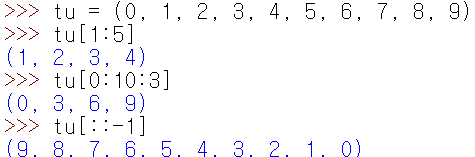 튜플과 스트링의 슬라이싱도 리스트와 동일한 방식을 사용한다.