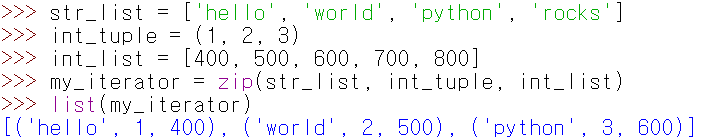 세 종류의 자료형 데이터 중 요소가 가장 적은 것은 3개가 있는 int_tuple이다. 그래서 세가지를 zip() 함수로 묶으면 가장 작은 수에 맞춰 3개의 튜플이 생성된다.