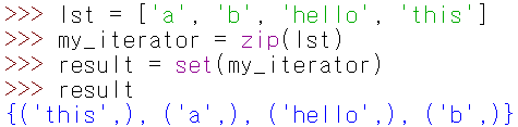 zip() 함수에 하나의 반복가능 자료형 인자를 전달한 경우이다. 중괄호 내부에 튜플이 하나씩 만들어진다.