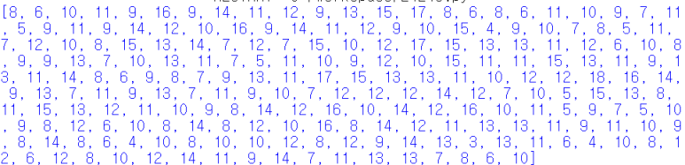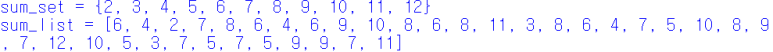 위 코드를 보면 주사위의 가장 작은 눈 1의 두개 합이 2이고, 가장 큰 눈의 합 6과 6은 12가 된다. 다른 합은 몇가지 서로 다른 방식으로 나올 수 있지만, 집합은 중복을 허용하지 않기 때문에 나올 수 있는 수는 2에서 12까지 11가지이다.