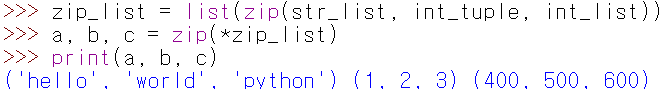 zip() 함수로 묶인 튜플들을 원래의 반복가능 자료로 되돌리기도 가능하다. 다른 함수를 쓰는게 아니라 zip() 함수에 묶은 자료를 인자로 입력하고 * 연산자를 인자 앞에 붙여서 수행한다.