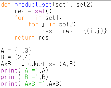 이 집합에는 (i, j) 라는 두개의 요소를 가진 튜플들이 채워지게 되며, i와 j는 인자로 주어진 집합 set1과 set2에서 하나씩 얻어온다. 따라서 이 함수는 두 집합의 요소를 하나씩 취해 만들 수 있는 모든 튜플을 생성하여 이를 원소로 하는 집합을 생성하여 반환한다. 이것은 두 집합의 곱집합이 된다.