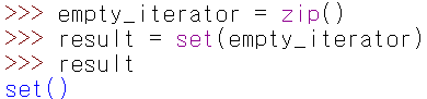 인자가 전달되지 않으면 zip() 함수는 공백 반복자를 반환한다. 반복가능 자료형이 하나 들어오면 zip() 함수는 튜플형 반복가능 자료형을 반환한다. 이 튜플의 각 원소는 인자로 넘어온 데이터에서 얻어진 값 하나씩이 전달된다.