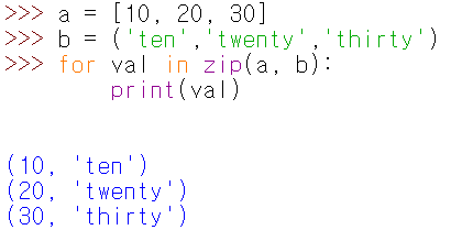 이 코드를 수정하여 a = [10, 20, 30], b = ('ten', 'twenty', 'thirty')의 리스트와 튜플을 zip()함수에 넣어보자
