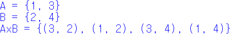 이 두 집합의 곱집합은 A * B로 표현하며, 그 원소는 { (a, b) | a ∈ A, b ∈ B} 와 같이 집합 A의 임의의 원소 a와 집합 B의 임의의 원소 a와 집합 B의 임의의 원소 b를 이용해 만들 수 있는 모든 튜플 (a,b)의 집합이 된다.