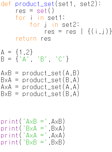 두 집합이 주어졌을 때 집합의 곱집합을 구하는 함수는 다음 코드와 같이 구할 수 있다. 이 코드에는 하나의 함수가 나타난다. 이 함수는 두개의 집합을 인자로 바아 결과를 반환하는 하나의 행으로 구성되어 있다. 이 함수를 호출하면 집합을 반환한다.