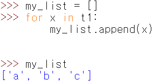 반복가능 자료형에 담겨있는 내용을 가지고 새로운 리스트를 만들고 싶을 때 아래의 코드처럼 for문을 사용한다.