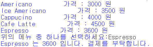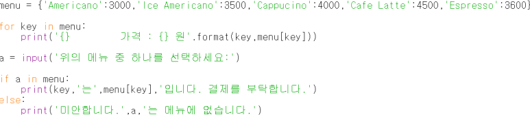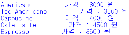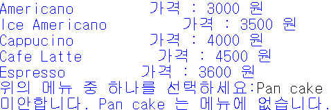 2) 카페 손님으로부터 다음과 같은 주문을 받은 후 주문한 내용이 메뉴에 있는지 구하는 프로그램을 작성하라.