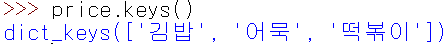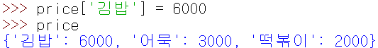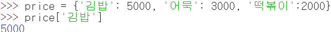 price = {'김밥': 5000, '어묵': 3000, '떡볶이':2000}