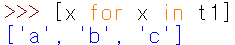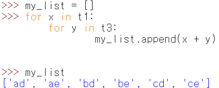 아래는 t1과 t3의 원소들을 이용하여 가능한 모든 쌍을 서로 결합하여 리스트를 만드는 코드이다.