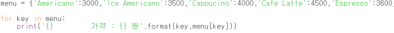 1) menu의 내용을 for key in menu: 구문을 사용하여 출력하여라.