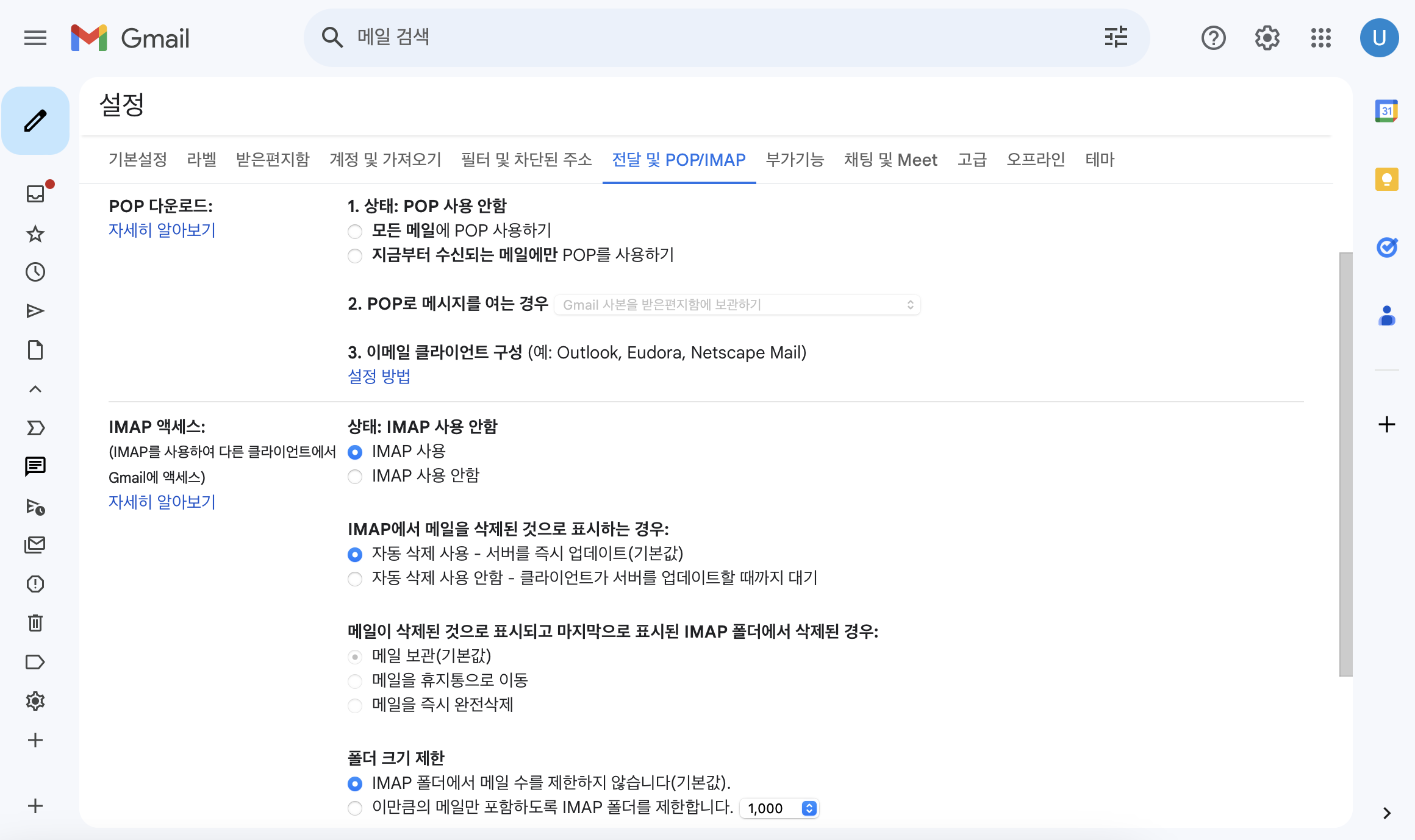 위와 같이 "IMAP 사용", "자동 삭제 사용", "폴더 크기 제한 - 메일 수 제한 안함"으로 설정해준다.
