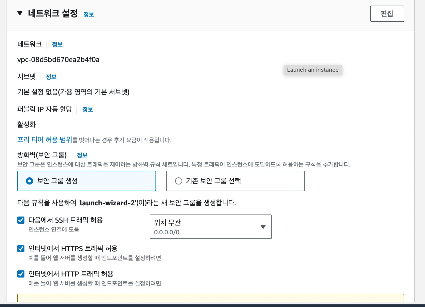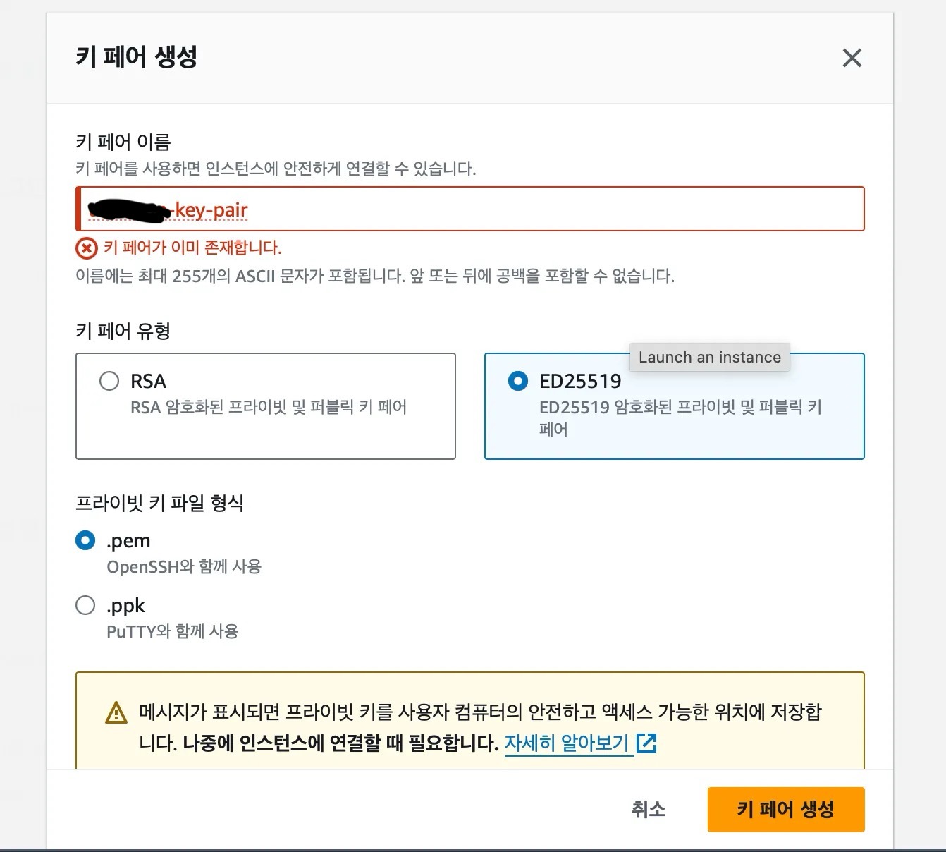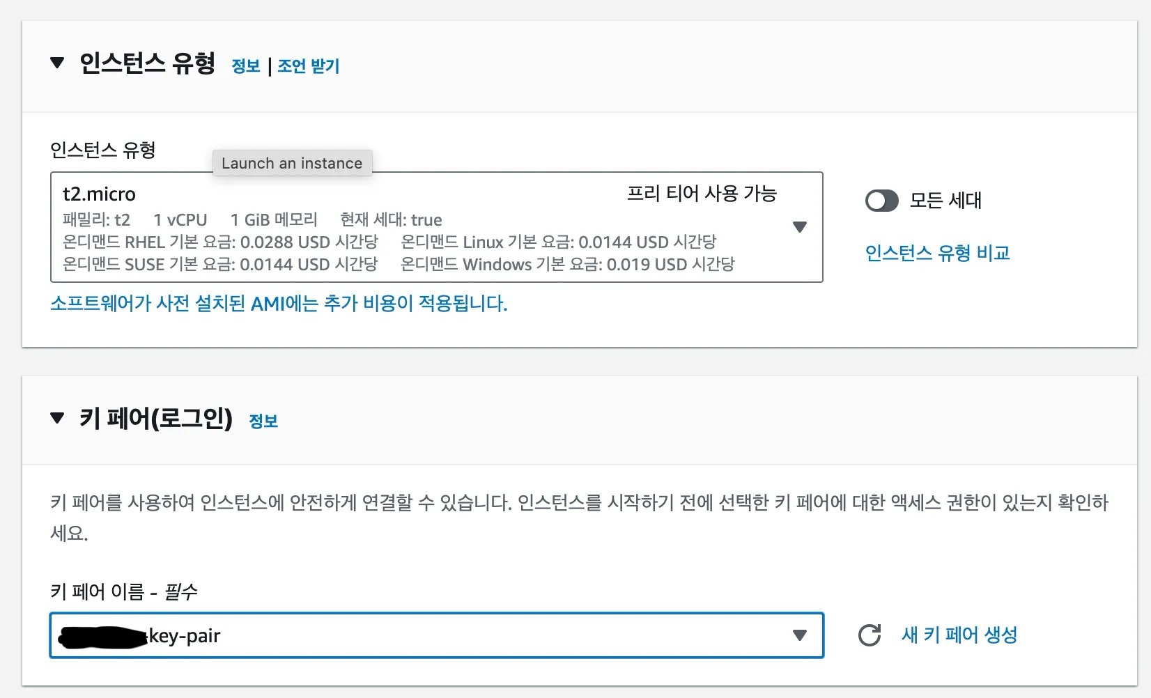 인스턴스 유형은 t2.micro를 선택하고 키 페어는 새로 생성해주었다.(권장) 키 파일은 한 번만 다운 가능하며 잃어버리면 SSH 접속 불가하므로 꼭 안전하게 보관해야 한다.