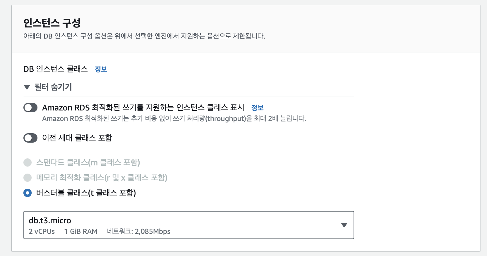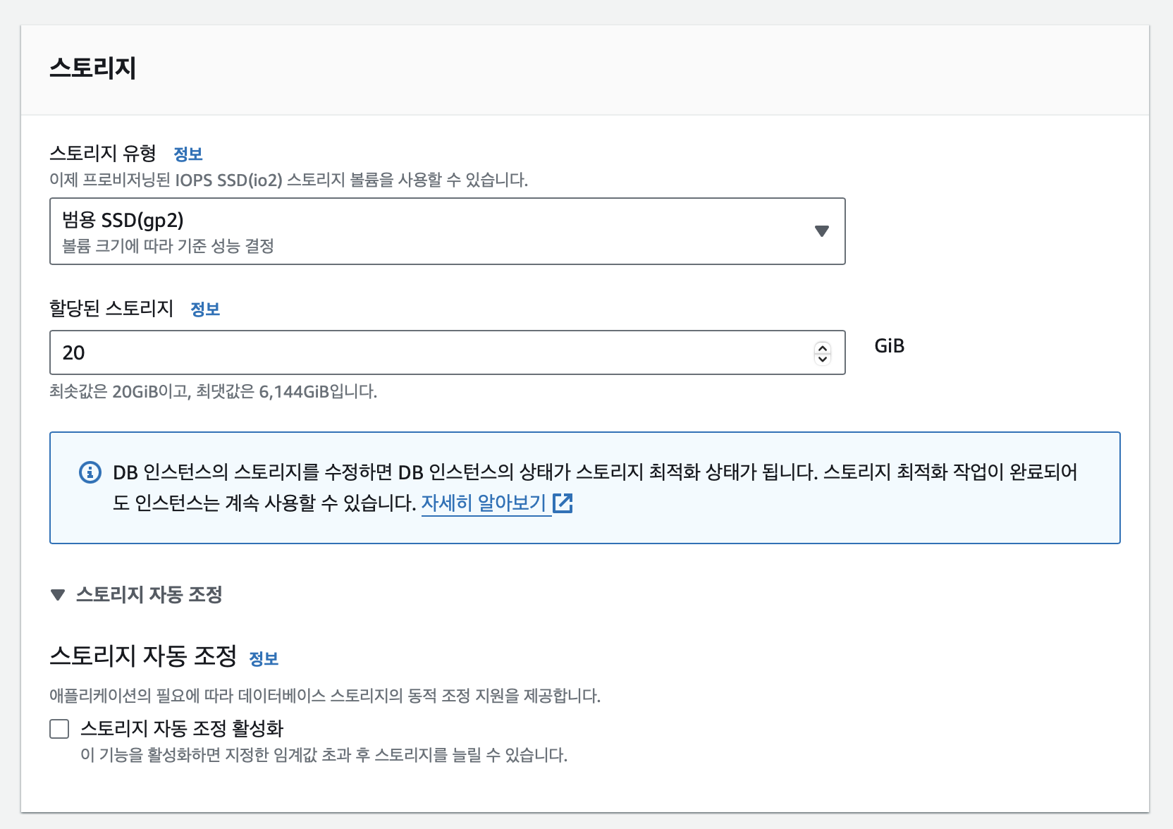 인스턴스랑 스토리지 구성은 고냥 기본값으로 두었다. (과금 방지를 위해 스토리지 자동 조정은 비활성화를 시켜준다.)