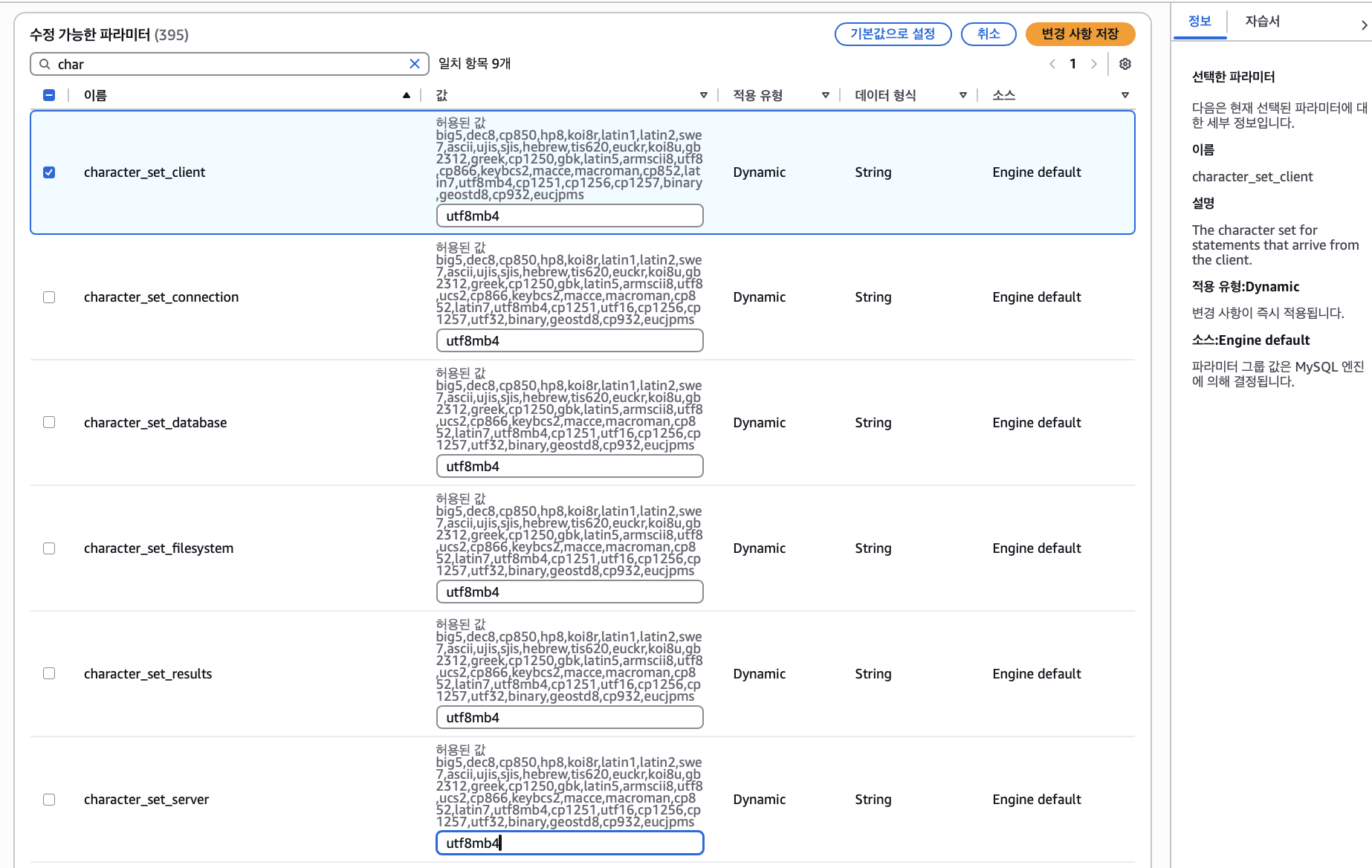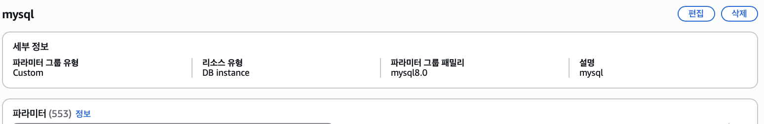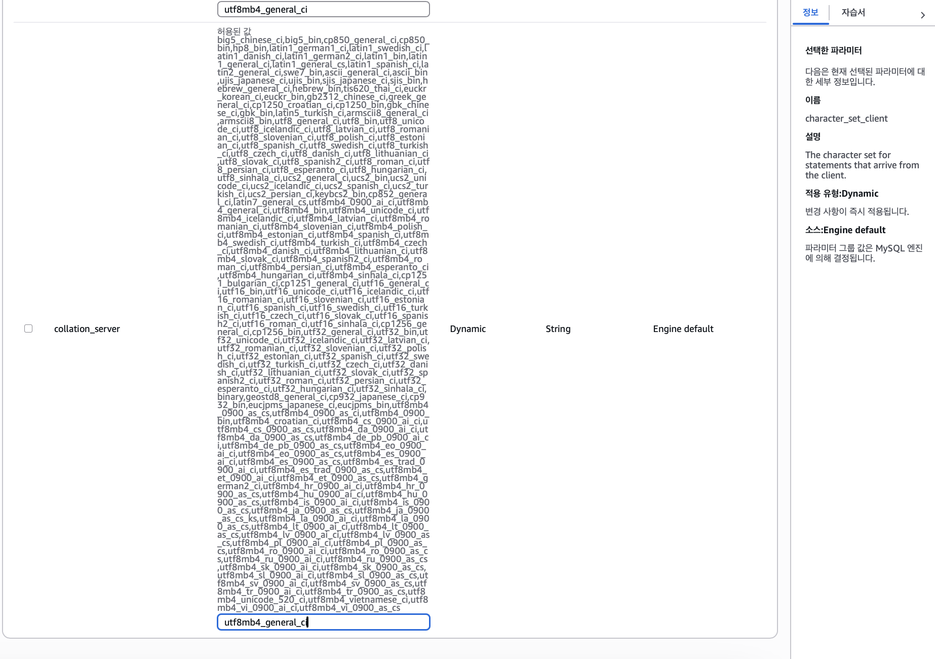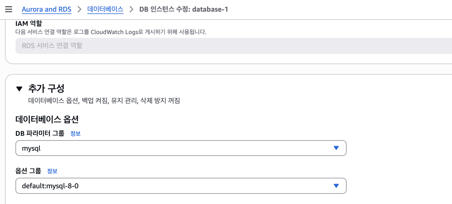 아까 생성해준 RDS에 들어가 수정을 누른 뒤, 데이터베이스 옵션의 DB 파라미터 그룹을 변경해준다.