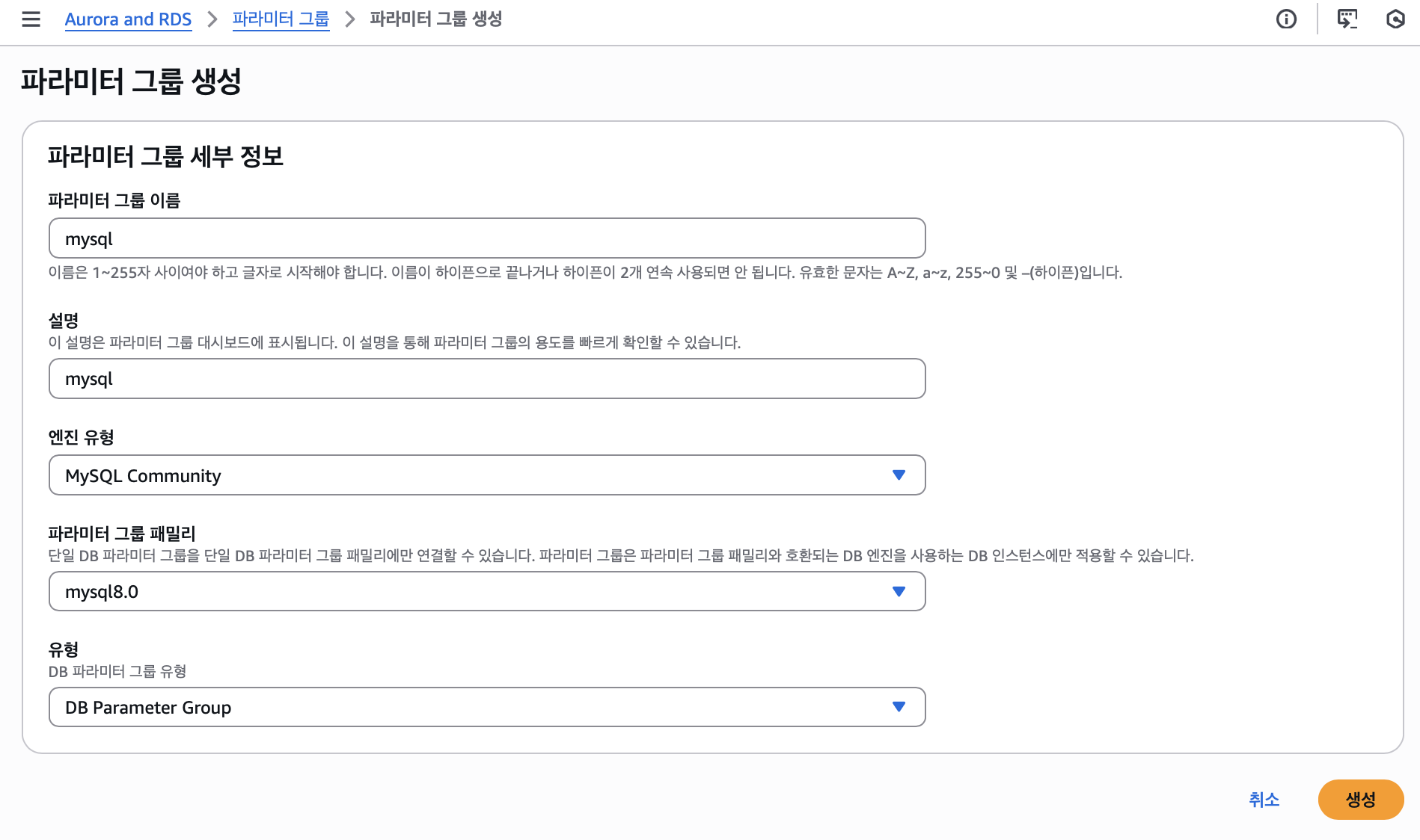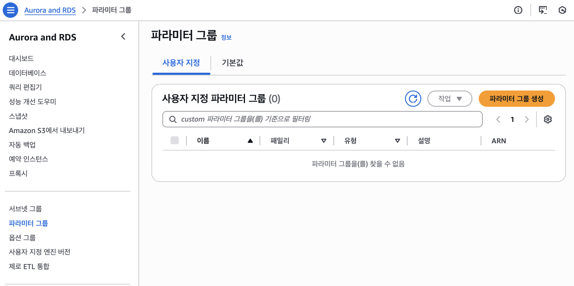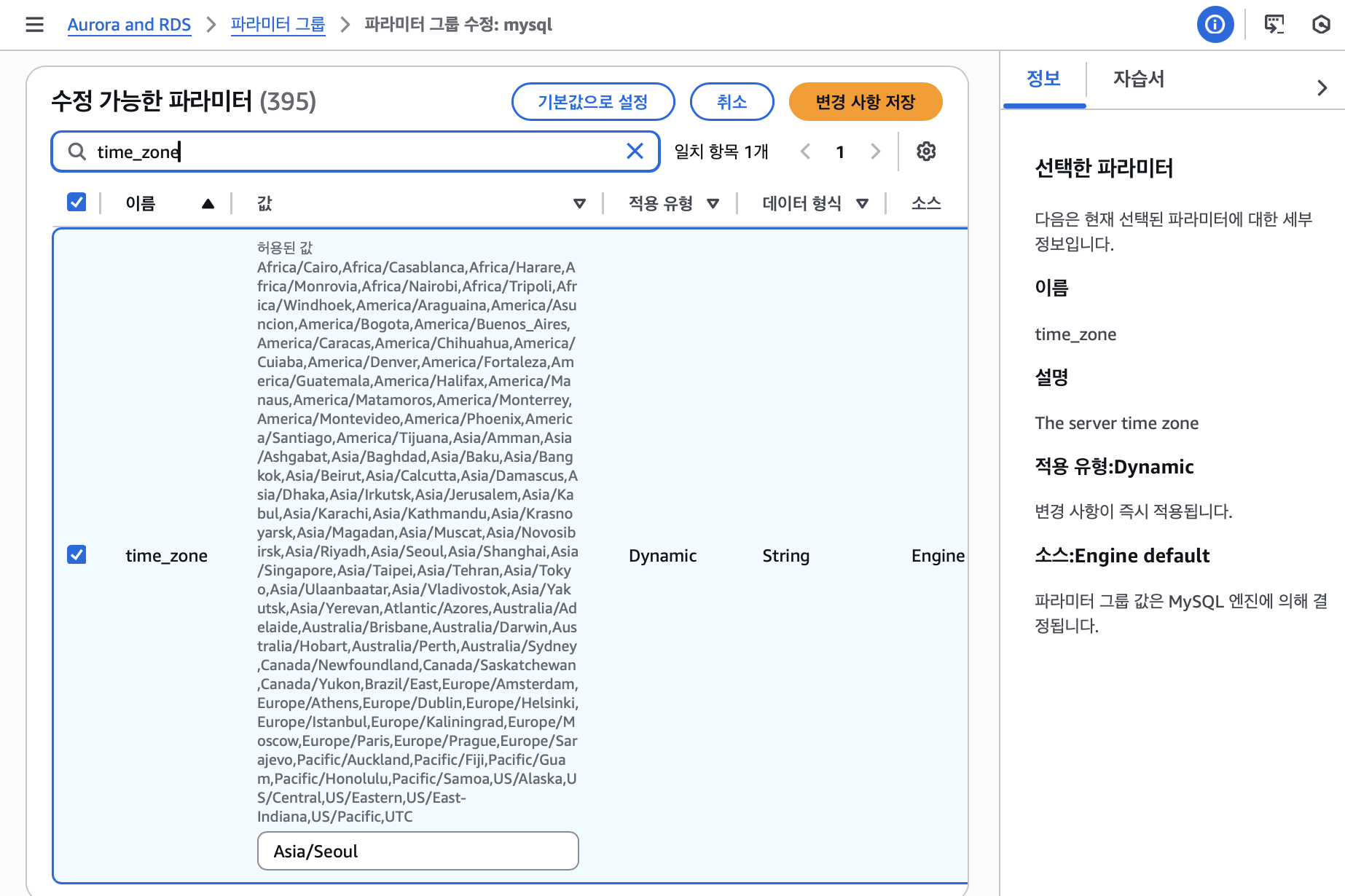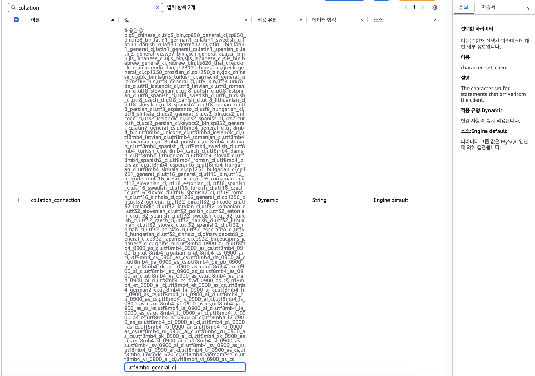아까 생성해준 RDS에 들어가 수정을 누른 뒤, 데이터베이스 옵션의 DB 파라미터 그룹을 변경해준다.