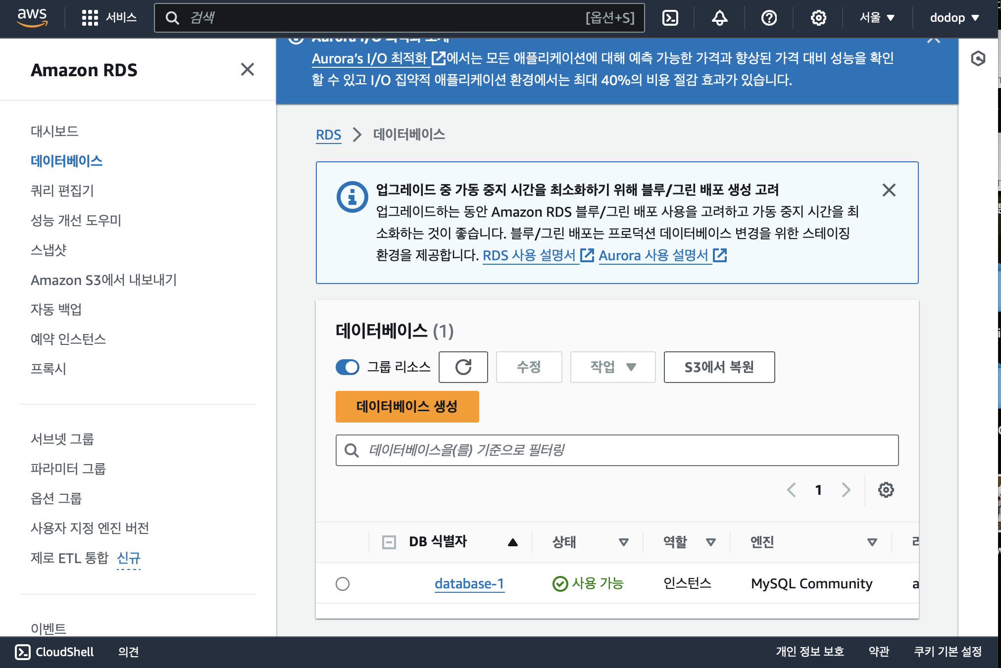 AWS에서 RDS를 검색하여 데이터베이스로 들어가 데이터베이스를 생성해준다.