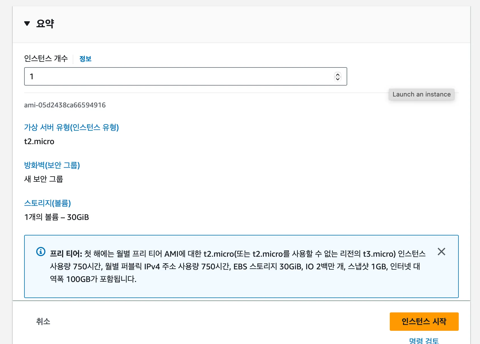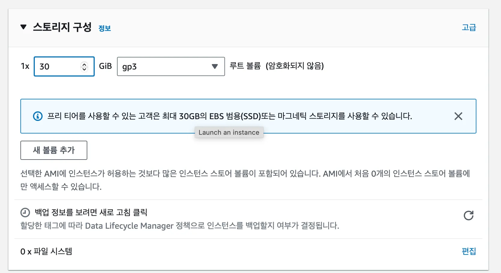 스토리지 볼륨은 프리티어 고객이 사용한 가능한 최대 용량인 30GB로 설정해준다.