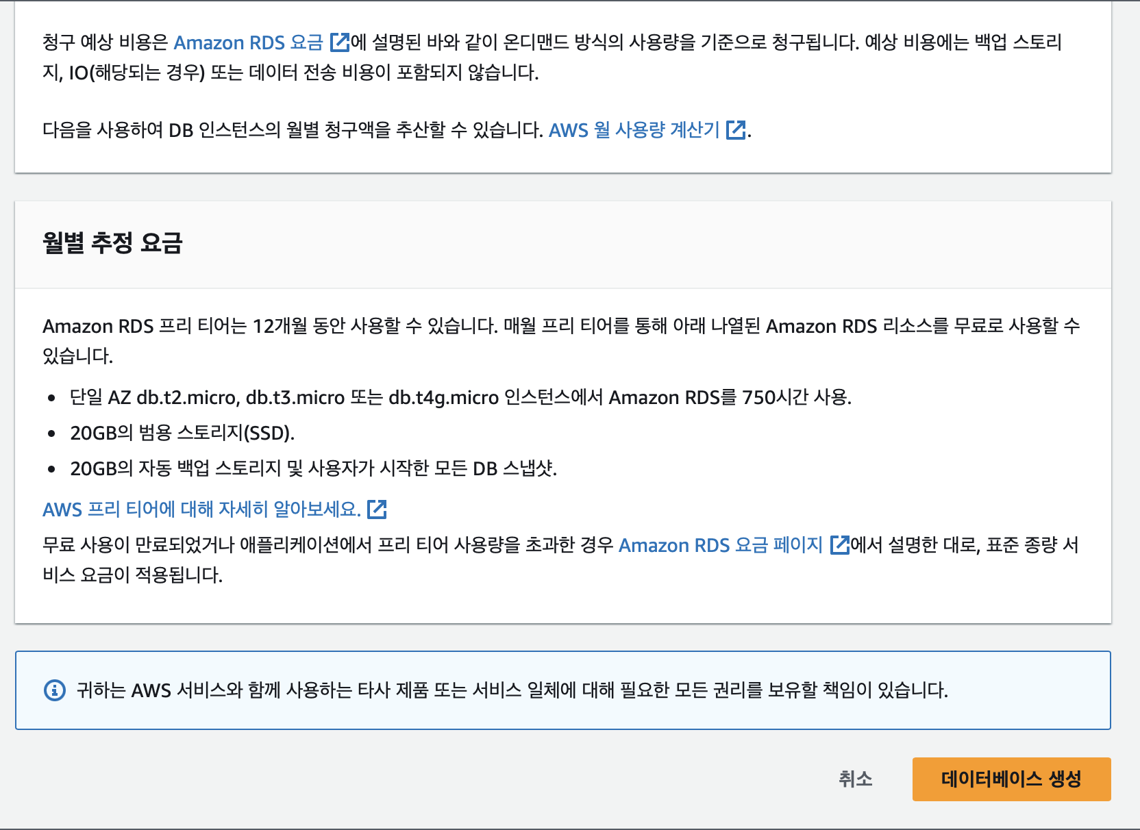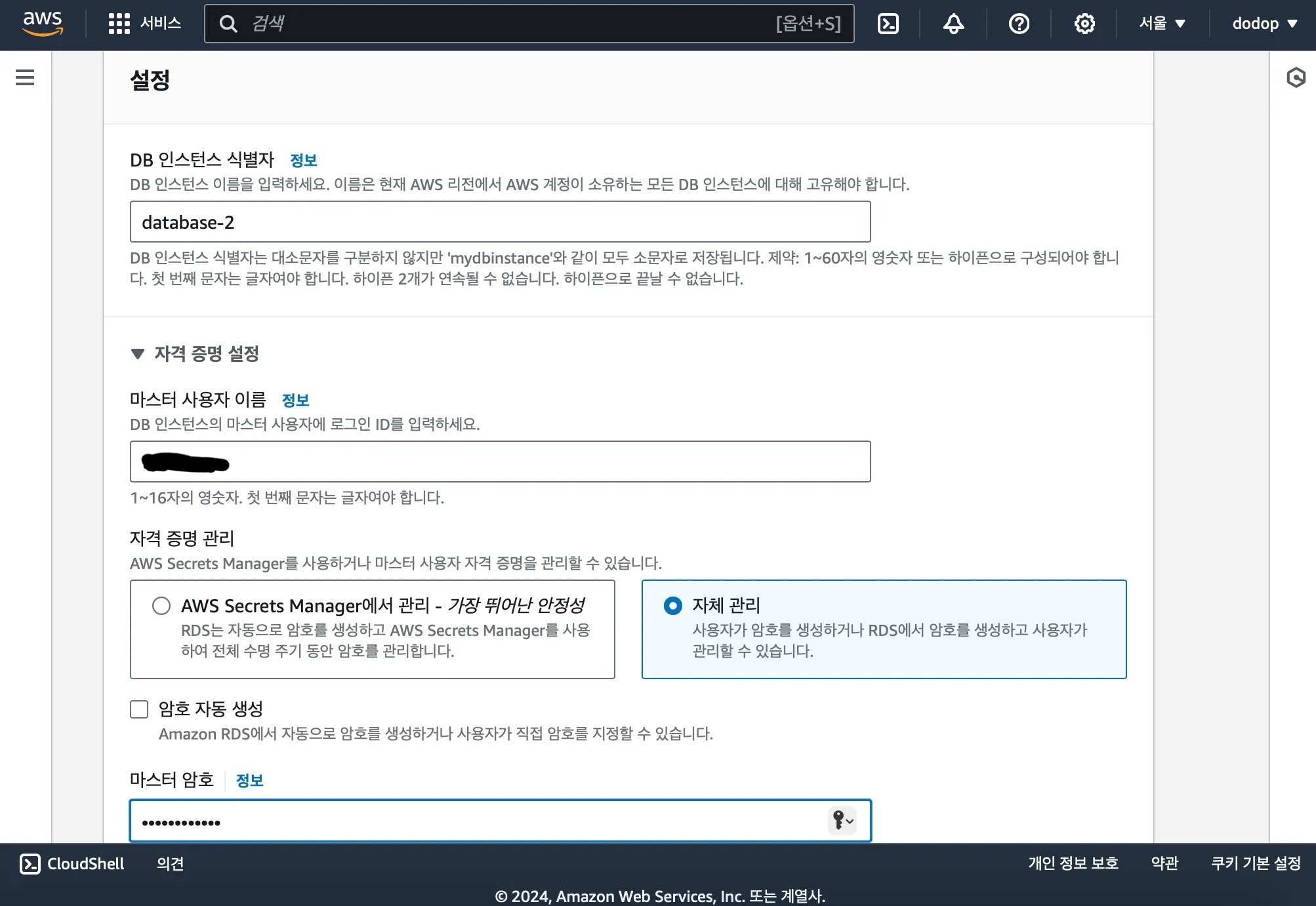 인스턴스 식별자는 변경해주어도 상관없다. 마스터 사용자 이름 또한 사용자 마음대로 지정 가능하다. 자격증명관리는 자체관리로 설정하여 마스터 암호를 자체적으로 지정해주었다.