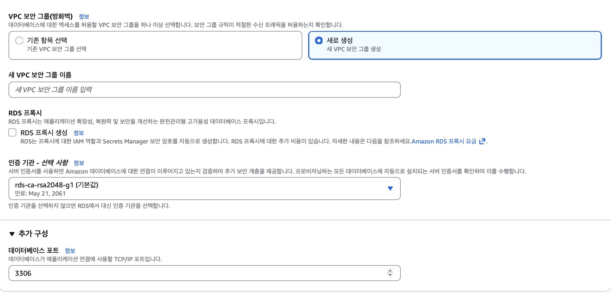 VPC 보안 그룹은 EC2 생성 시 생성해준 보안그룹과 구분하여 새로 성생해주는 것이 좋다. 새로 생성해준 보안 그룹의 인바운드 규칙에 mySQL의 포트인 3306을 추가해준다.