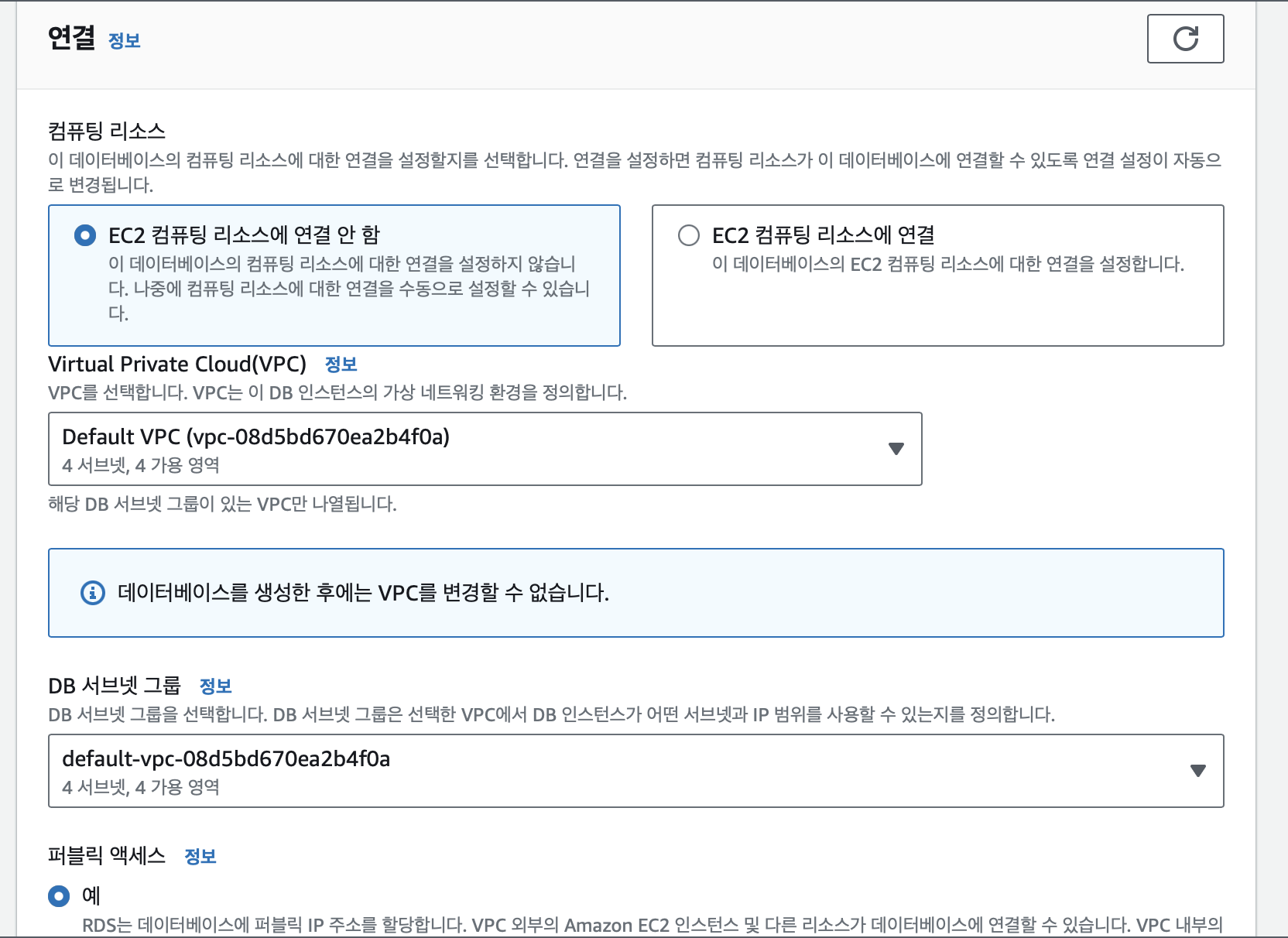 EC2 컴퓨팅 리소스에 연결 안 함을 선택하고, 퍼블릭 액세스 예로 변경해준다.