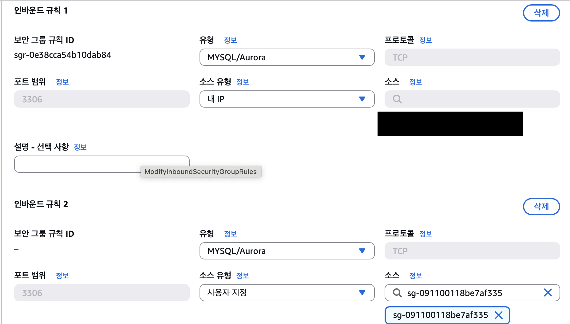 개발 초반에는 MYSQL의 보안그룹의 소스가 0.0.0.0/0으로 모든 IP 허용으로 두고 개발을 하는 것이 편리하겠지만, 추후에 보안상의 문제를 대비하여 위와 같이 내 IP와 생성해준 EC2 인스턴스의 보안 그룹 ID로 등록하여 나의 로컬환경 intelliJ와 EC2 인스턴스로 DB에 접근하도록 하는 것이 좋다.