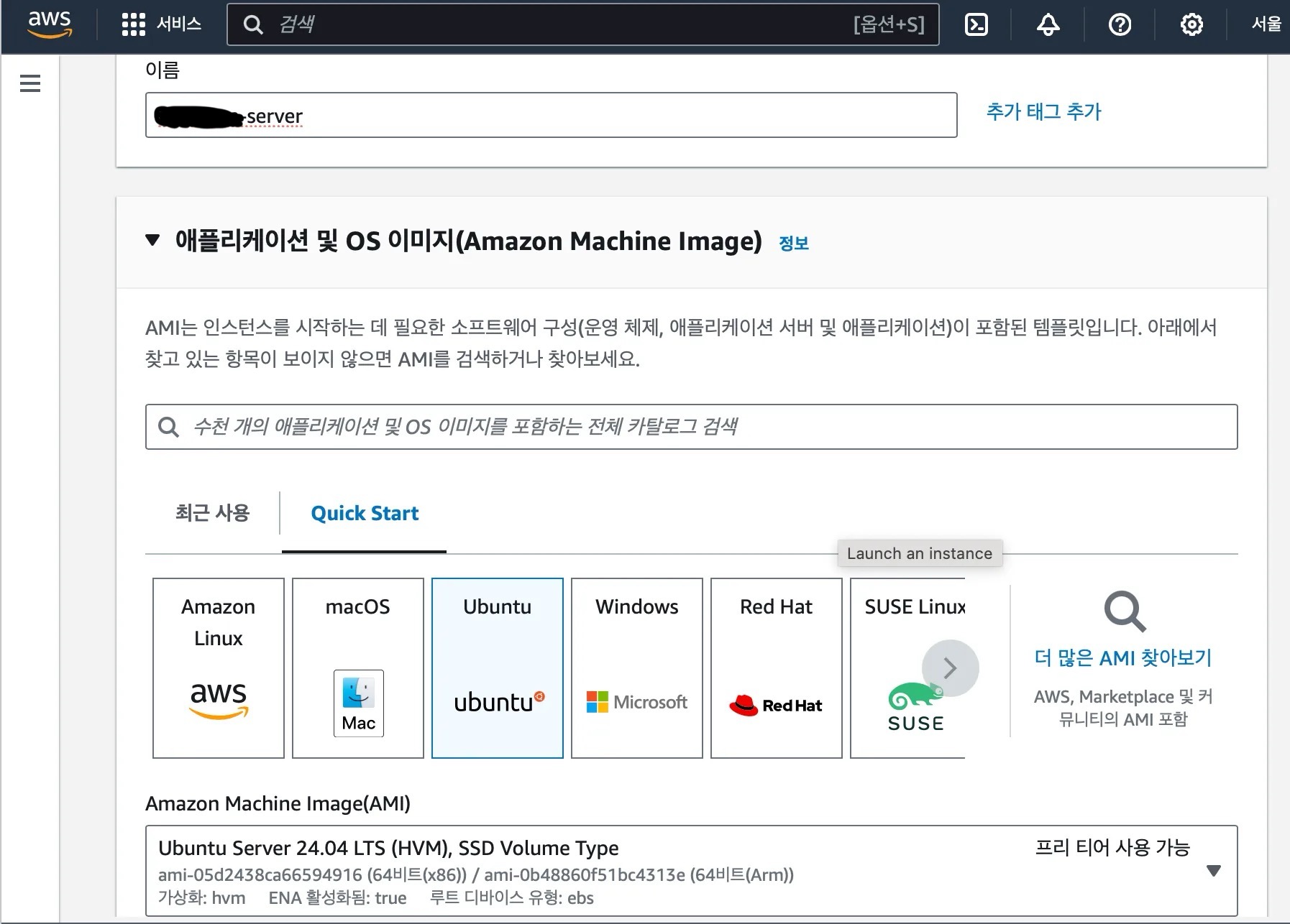 인스턴스 이름 생성 > 우분투(Ubuntu) 선택 > AMI는 프리 티어 사용 가능한 것으로 선택