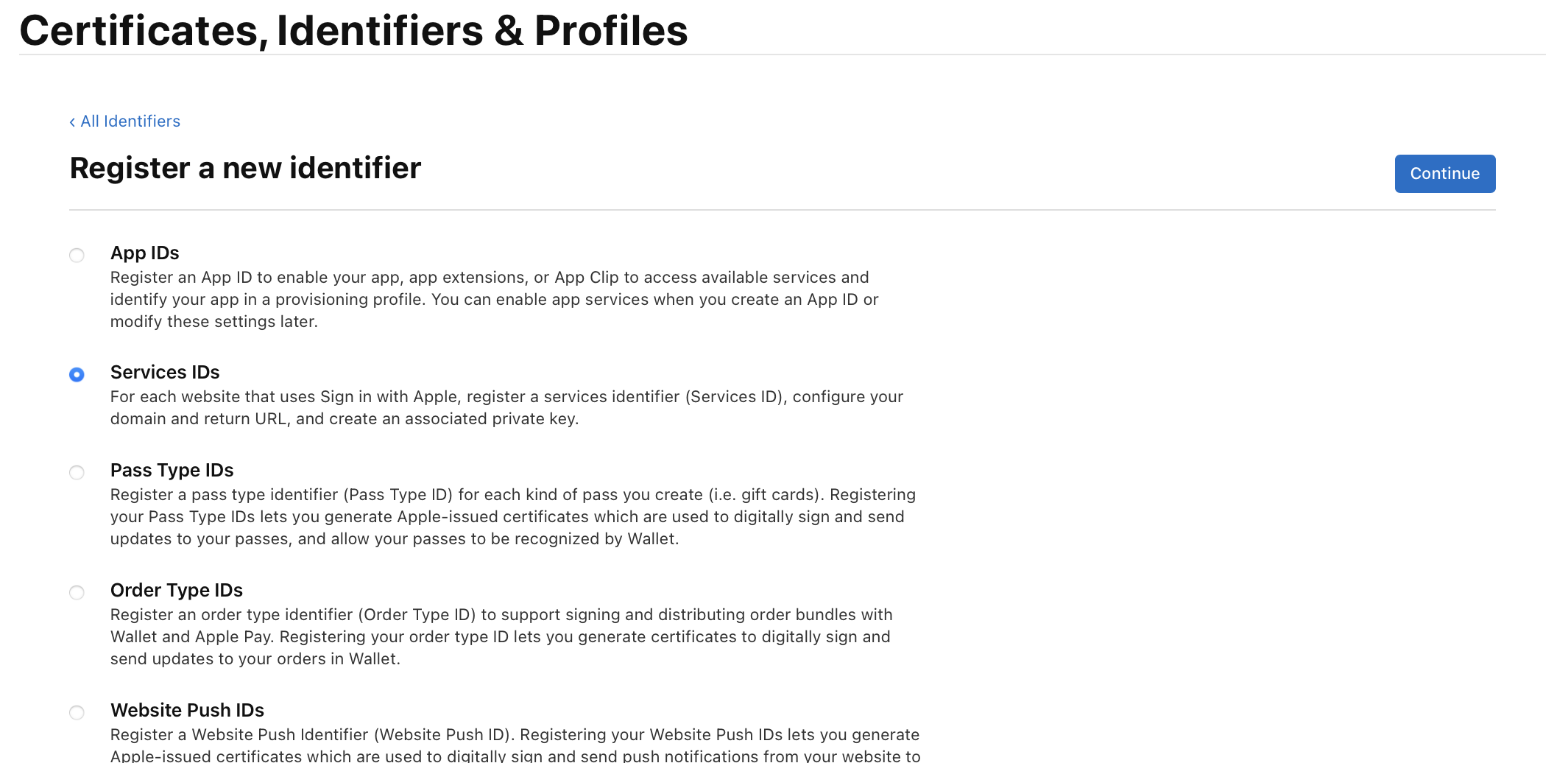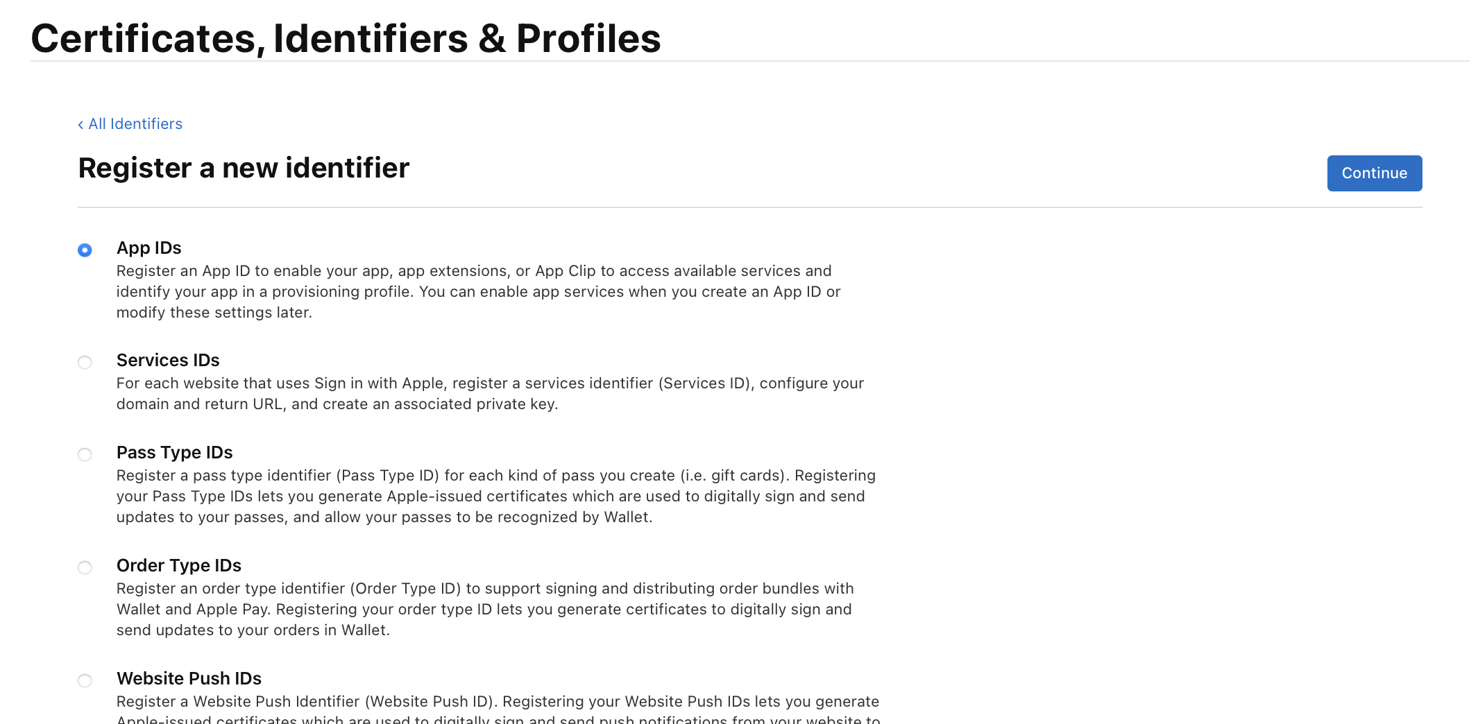 App IDs를 선택하고 continue를 눌러준다.