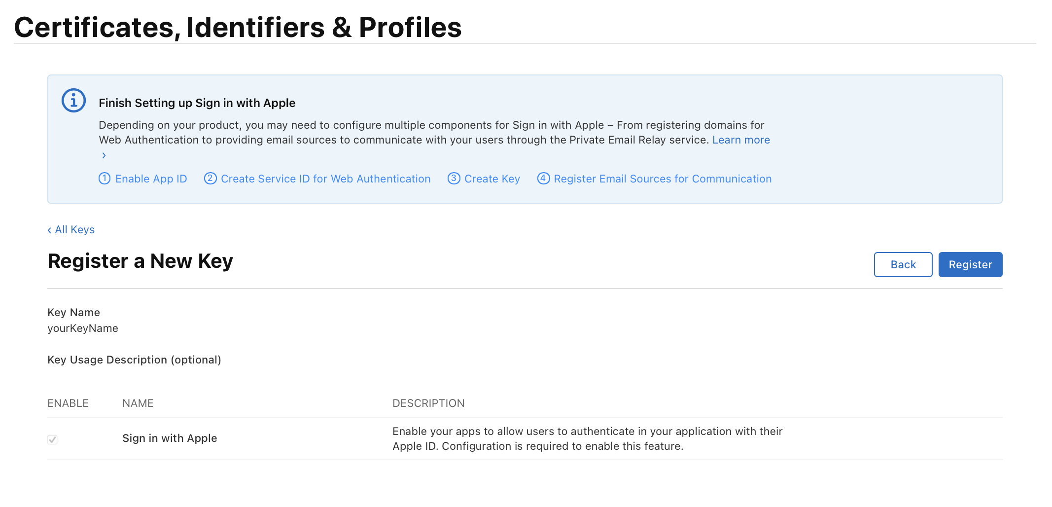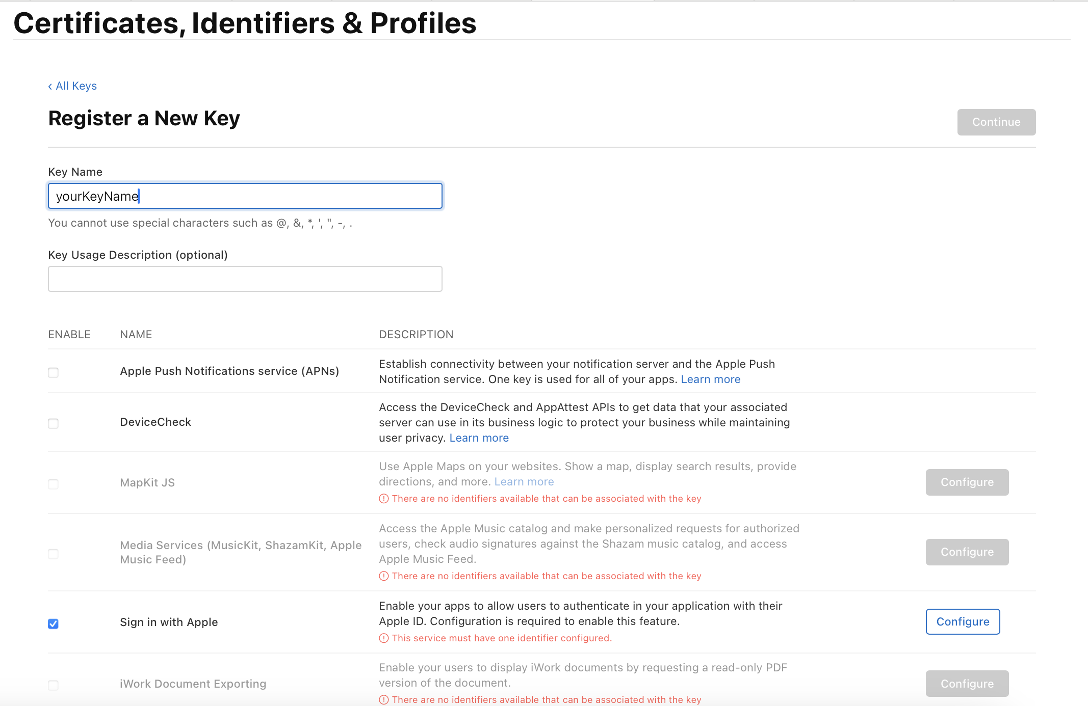 Key Name 설정을 해주고, Sign In with Apple의 Configure를 눌러준다.