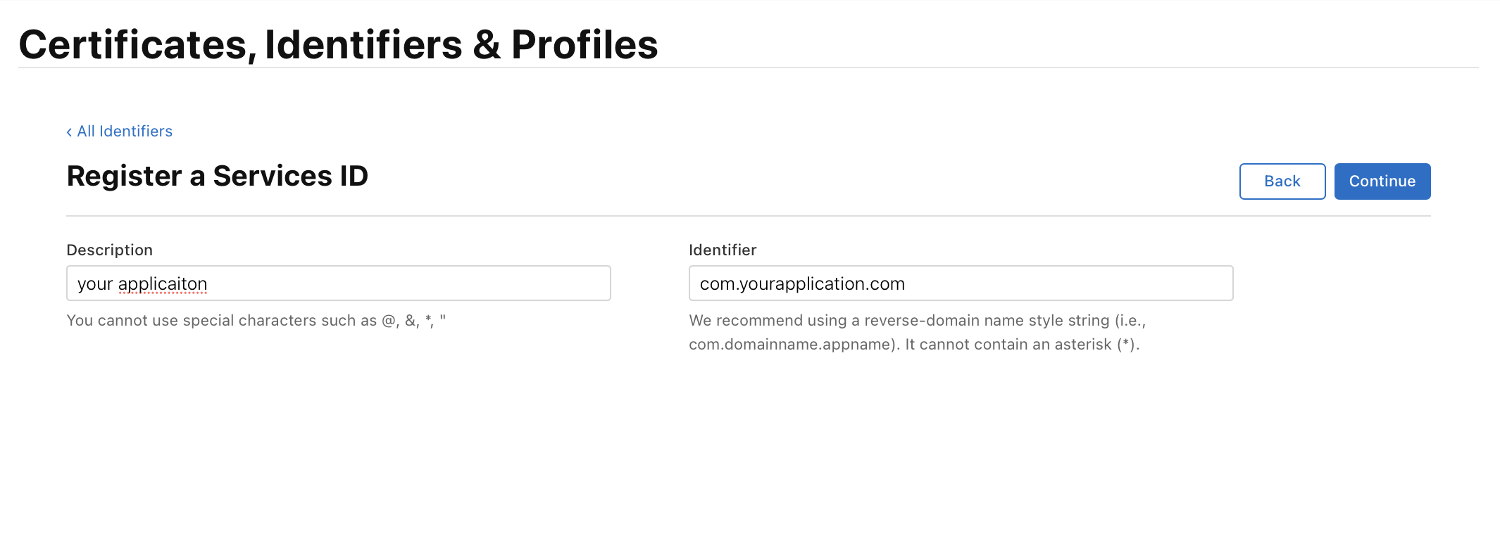 Discription과 Identifier를 지정하여 작성해준다. (Identifier는 domain을 반대로 뒤집은 string style을 추천한다고 되어있다.)