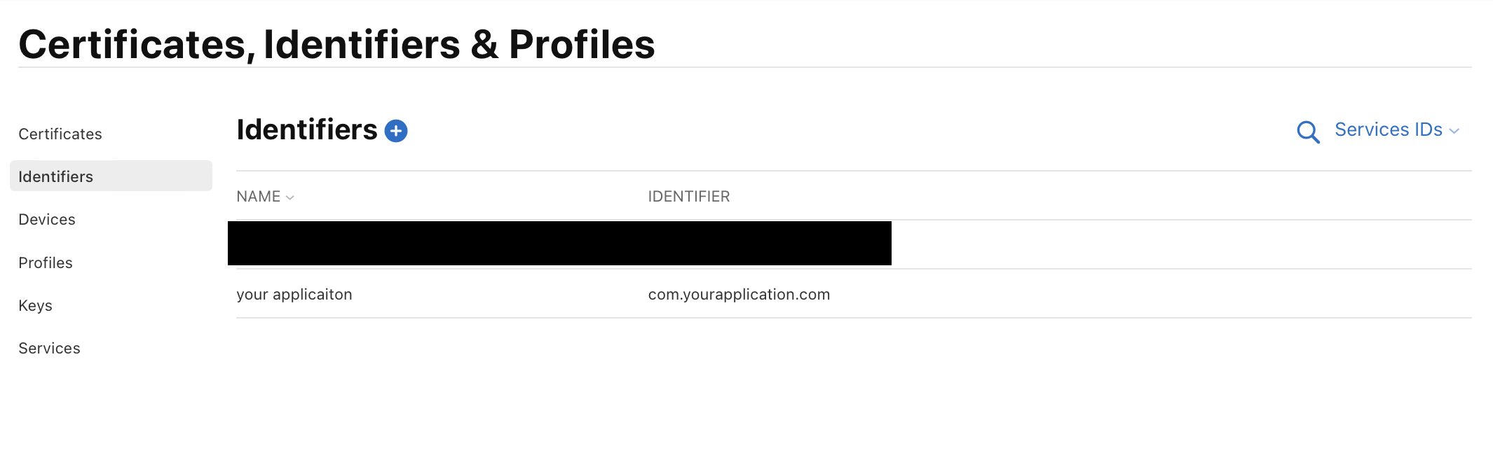 서비스 아이디도 동일하게 identifiers에서 +버튼을 눌러 생성해준다.