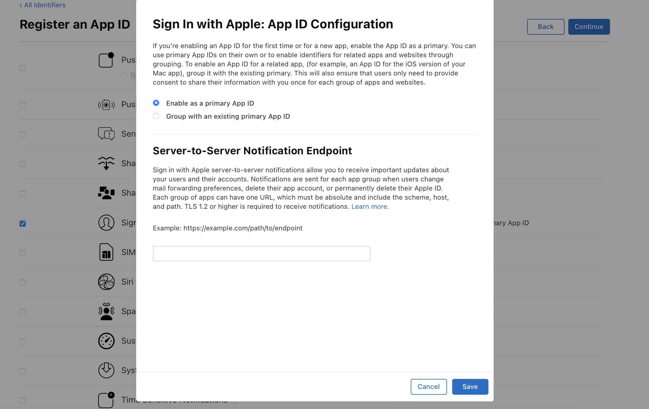 Enable as a primary App ID를 체크해주고, 아래 Server-to-Server Notification Endpoint는 나중에 채워주어도 상관없다. 이는 애플 사용자의 메일 전달 설정을 변경하거나, 앱 계정을 삭제하거나, Apple ID를 영구적으로 삭제할 때 필요한 endpoint로 위와 같은 기능을 구현해준다면 작성해주어야 한다.