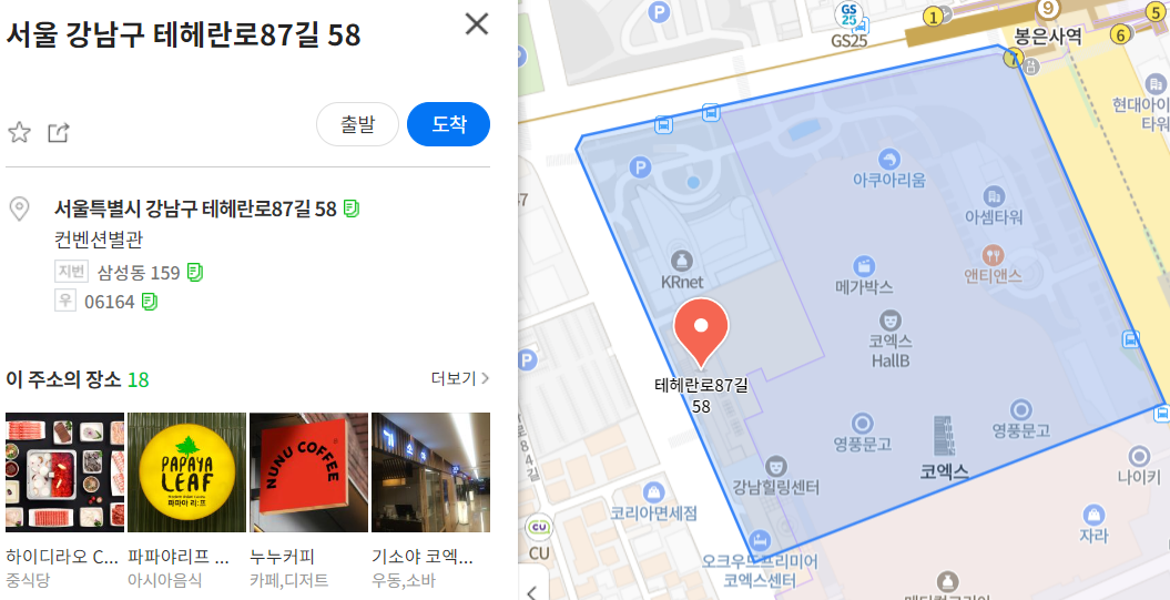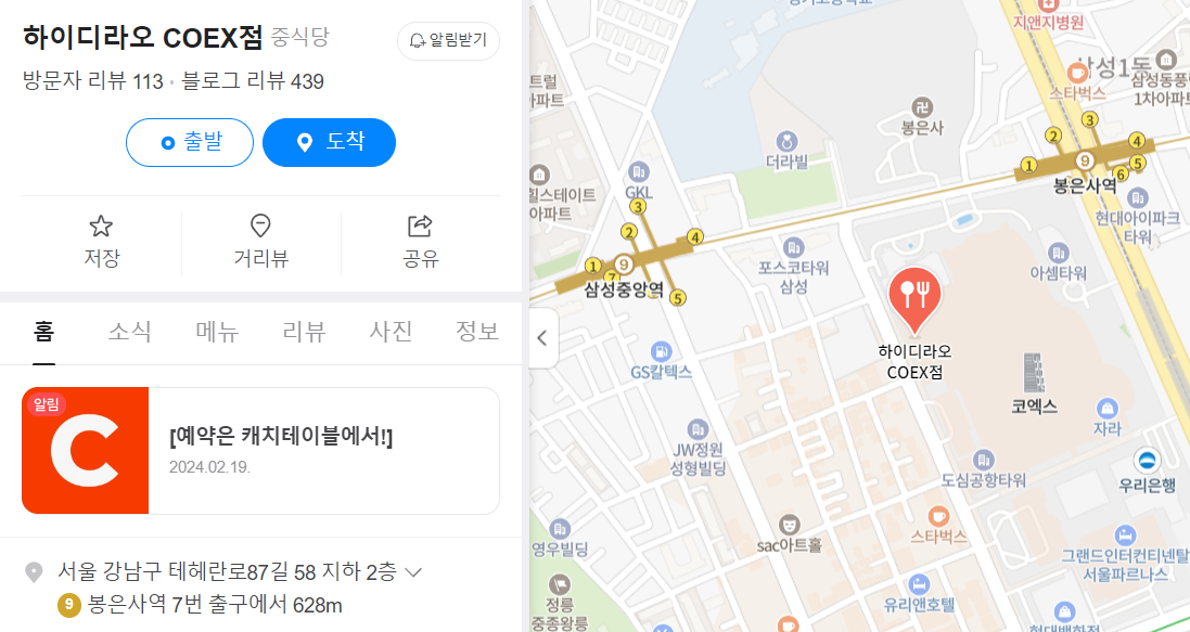 이 상태로 하이디라오 코엑스 점을 다시 검색하면