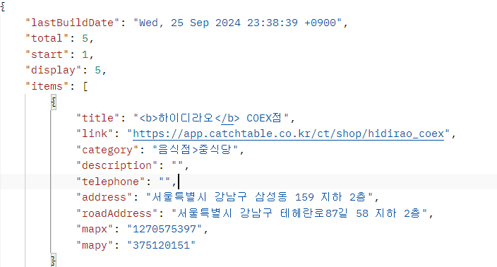 display : 한 번에 표시할 검색 개수(최대 5개로 제한)start : 검색 시작 위치sort : 검색 결과 정렬 방법. random은 정확도순으로 내림차순 정렬하며 기본값이다. comment는 업체 및 기관에 대한 카페, 블로그의 리뷰 개수순으로 내림차순 정렬한다.