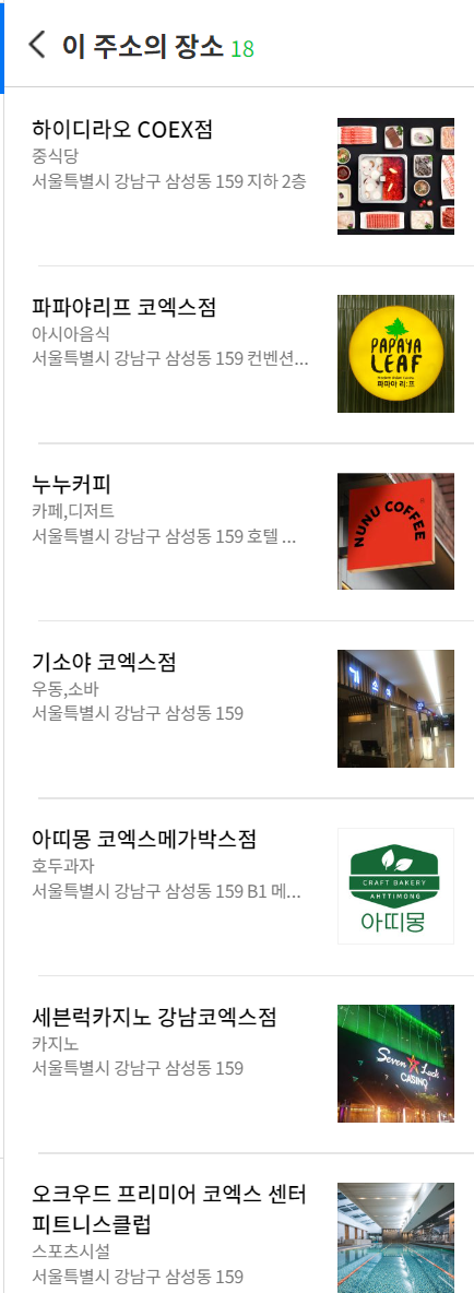 결과가 없거나 해당하는 결과를 찾지 못했으면 csv파일에 저장된 가게이름과 주소값 일부(강남구.. 필요하다면 테헤란로까지)를 함께 검색해서 이 과정을 반복한다.