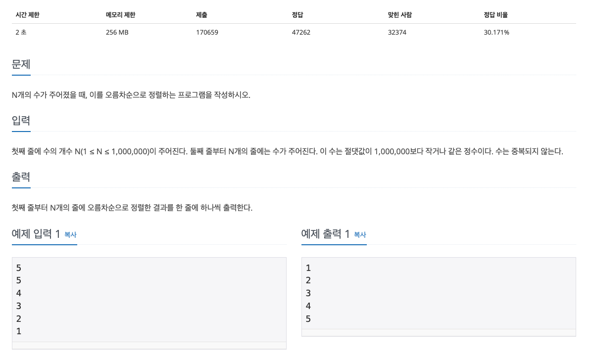 퀵 정렬을 이용해 수를 정렬하는 문제