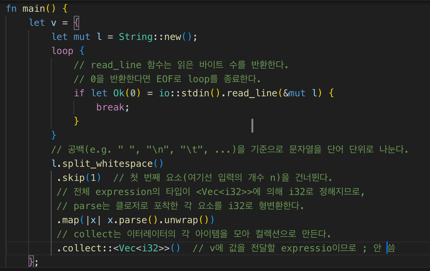 .collect<Vec>()에 세미콜론이 붙지 않는 걸 볼 수 있는데, 이 블럭이 let v에 값을 전달하기 위한 expression이기 때문이다.