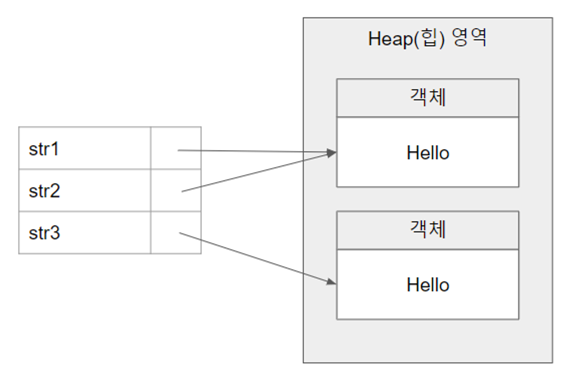 str1, str2, str3가 모두 동일한 문자열이지만 str1과 str2는 같고, str1과 str3는 다르다는 결과를 볼 수 있습니다. 자바는 문자열이 동일하다면 동일한 String 객체를 참조합니다. 그래서 str1과 str2는 동일한 String 객체의 주소 값을 가지고 있습니다. 반면 str3는 new 로 생성한 새로운 String 객체이므로 새로운 주소를 가지고 있습니다. 아래에 그림으로 표현하였습니다.