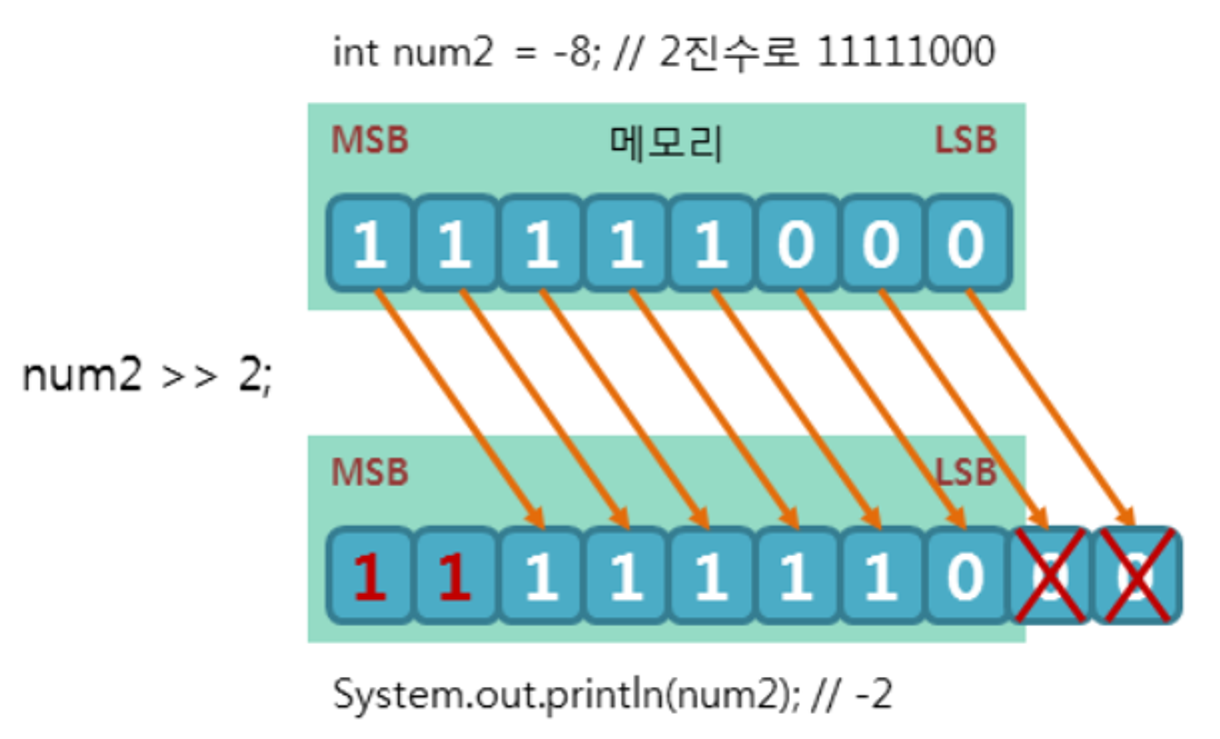비트 전체를 오른쪽으로 이동할 때 맨 오른쪽 2비트는 밀려서 버려지고, 맨 왼쪽에 새로 생긴 2비트는 최상위 부호비트(MSB)와 동일한 값으로 채워집니다. (최상위 부호비트가 0이면 양수, 1이면 음수입니다.) 연산 결과의 최상위 부호비트가 1이므로 2의 보수를 적용해보면 -2라는 값이 됨을 알 수 있습니다. (컴퓨터가 음수를 저장하기위해 2의 보수라는 방법을 사용합니다.)