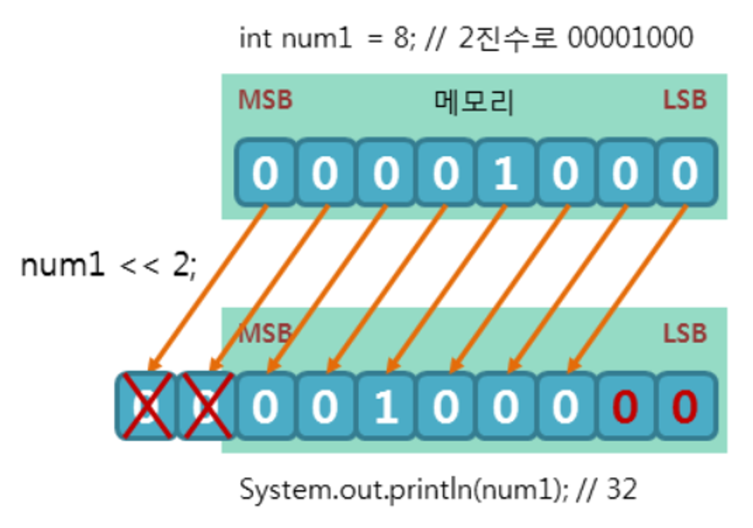 비트 전체를 왼쪽으로 이동할 때 맨 왼쪽 2비트는 버려지고, 맨 오른쪽에 새로 생긴 2비트는 0으로 채워집니다. 연산 결과를 10진수로 변환해보면 32가 됨을 알 수 있습니다.