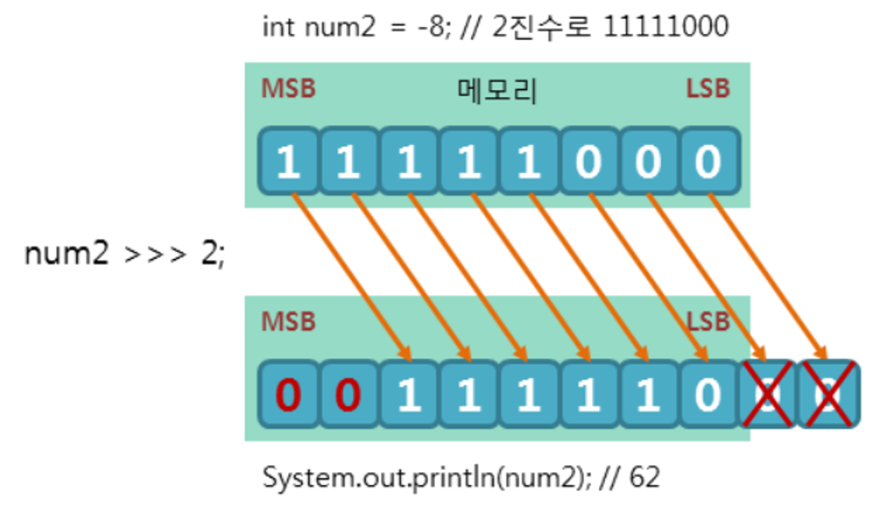 이번에는 정수 -8을 >>> 연산자로 2비트 오른쪽으로 이동시켜봅시다.