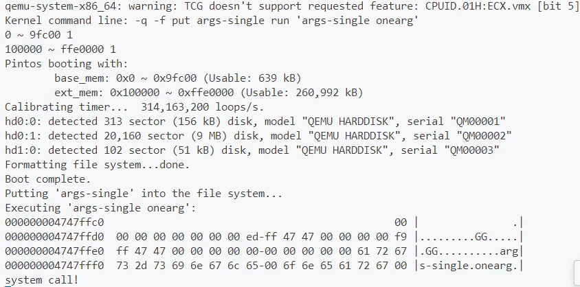 pintos --fs-disk=10 -p tests/userprog/args-single:args-single -- -q -f run 'args-single onearg'를 실행해서 테스트 결과를 확인하자.