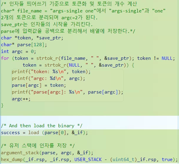 유저 스택에 파싱된 토큰을 저장하는 함수로 새로 만들어줘야한다.