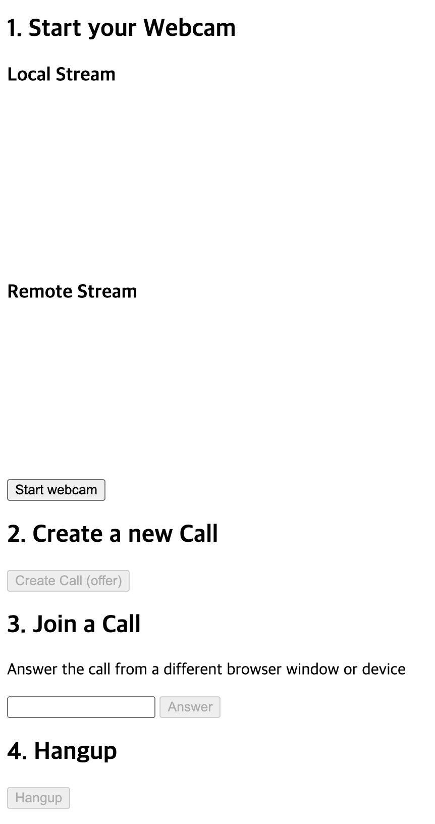 이후 실행해서 start webcam -> Create a new call 버튼을