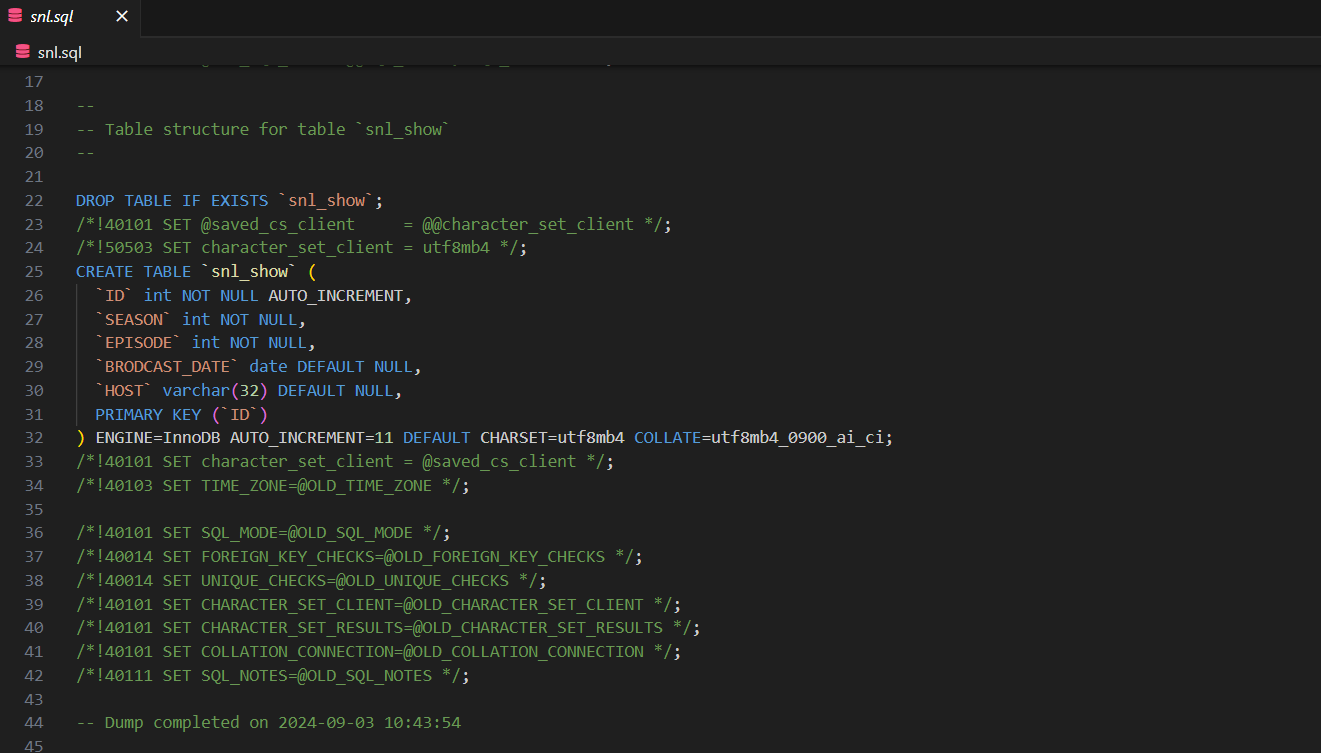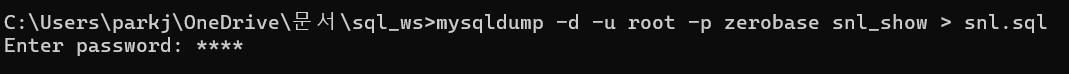 mysqldump -d -u root -p zerobase snl_show > snl.sql