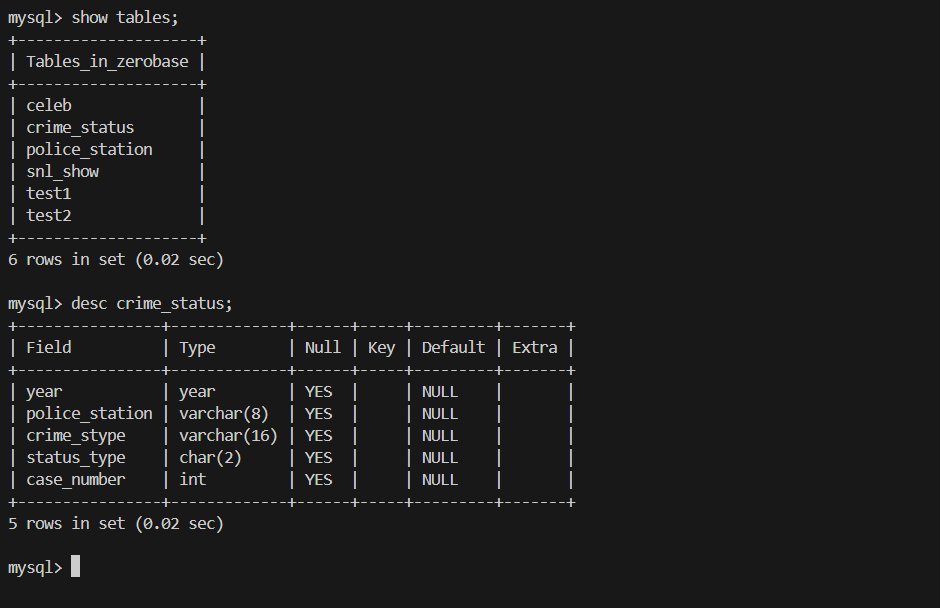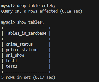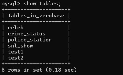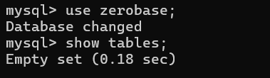 zerobase 데이터베이스에 접근하여 테이블 확인