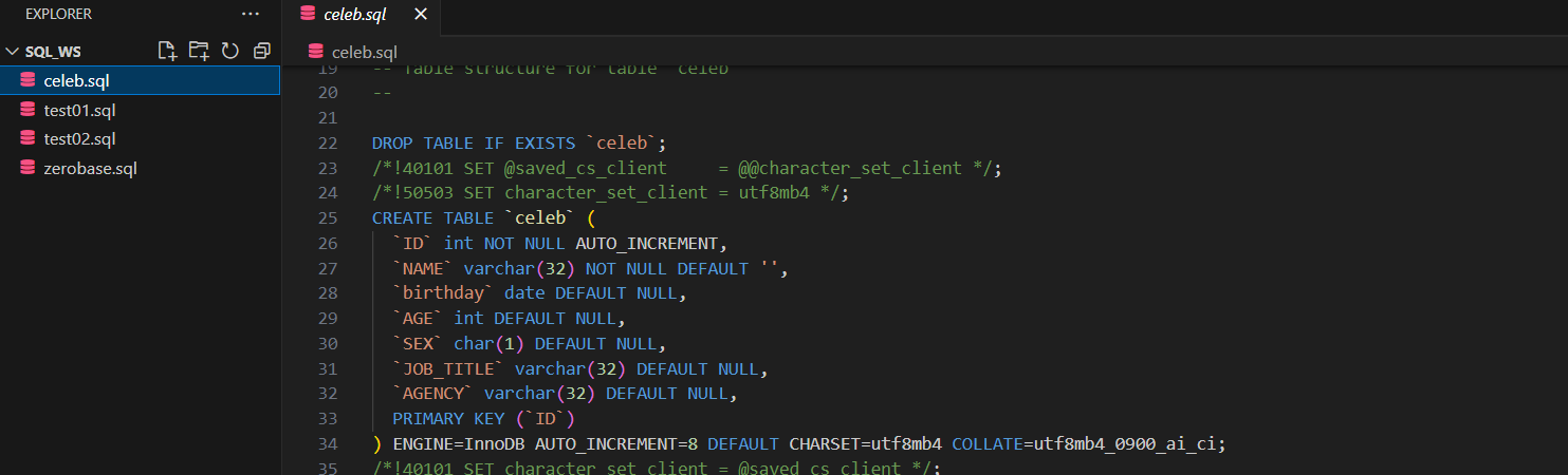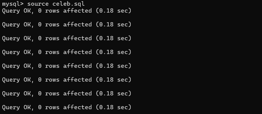 백업 해 두었던 celeb.sql 실행