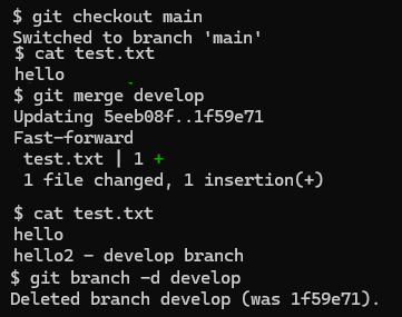 두개의 브랜치가 합쳐졌고, develop가 더이상 필요가 없어졌다면, git branch -d 브랜치이름 으로 삭제할 수 있다.
